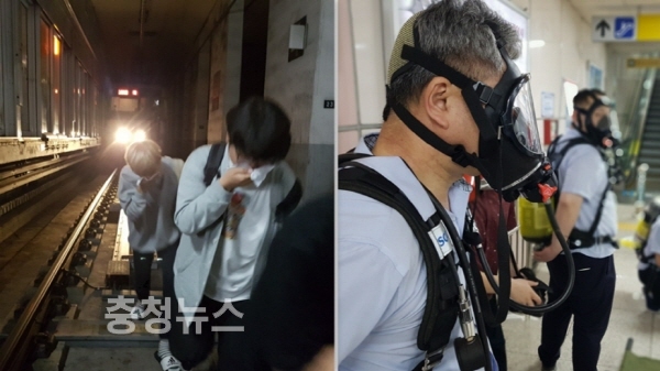 시민안전체험열차(좌), 화재현장에 출동한 역사 자위소방대원(우) / 충청뉴스 최형순 기자
