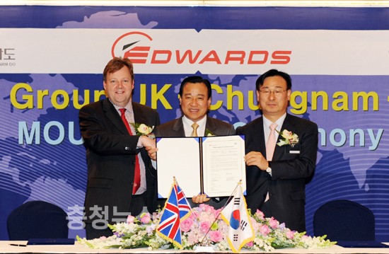 이완구 충남도지사, 박한규 천안부시장, 나이젤 헌튼(Nigel Hunton) 에드워드사 대표는 3월 4일, 서울 그랜드인터콘티넨탈호텔에서 약 4천5백만달러를 투자 드라이진공펌프1) 생산을 위한 협약(MOU)를 체결하였다
