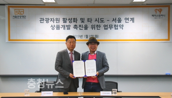 충청권 주류 대표기업 맥키스컴퍼니(회장 조웅래)와 서울관광재단(대표 이재성)은 8일 서울관광재단 대회의실에서 관광자원 활성화 및 서울-지방 연계상품개발 촉진 등 지역상생 협력체계 구축을 위한 업무협약(MOU)을 체결했다.