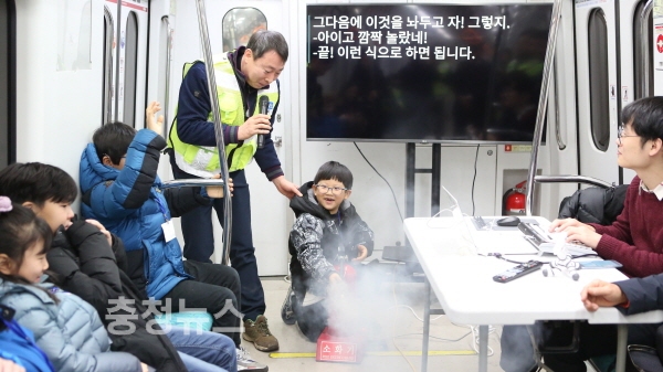 청각장애인 문자통역시스템을 활용한 도시철도공사 안전체험열차 행사에서 참여학생이 열차내 소화기 사용법을 익히고 있다.(왼쪽 안전관리팀 박종호교관, 왼쪽 사회적협동조합 이형열팀장)