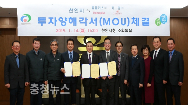 충남 천안시는 지난 14일 시청 소회의실에서 우량기업 ㈜홈플러스(대표 임일순)와 ㈜쟈뎅(대표 윤상용) 등 2곳과 투자양해각서를 체결했다고 밝혔다.