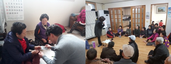 (좌로부터)신암면 별리2리 경로당, 봉산면 효교2리 경로당에 모인 어르신께 목욕권 배부중인 사진