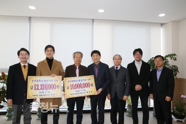 공주대학교(총장직무대리 박달원) 생물교육과 장창기 교수와 문헌정보교육과 변우열 교수는 16일 총장접견실에서 박달원 총장직무대리에게 대학발전기금을 전달했다.