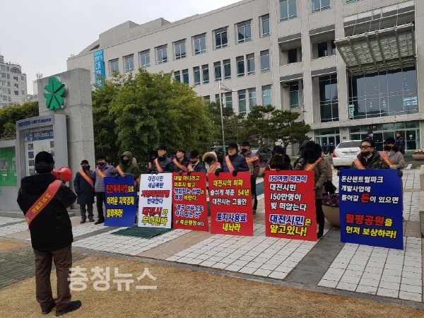 이들은 “대전시가 장기임대하거나 재산세 감면을 혜택이라는 사탕발림식 방안에 대해 동의하지 않음을 분명히 밝힌다”며 "월평근린공원은 미집행 사유재산이다. 대전시는 대한민국 헌법을 준엄하게 이행해야 한다”고 목소리를 높였다.