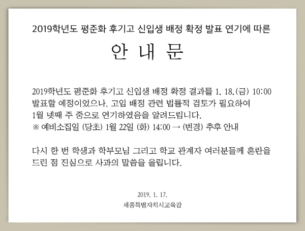 세종시교육청은 17일 2019학년도 평준화 후기고 신입생 배정 확정 결과를 18일 오전10시 발표할 예정이었으나, 고입 배정 관련 법률적 검토가 필요하여 1월 넷째 주 중으로 연기한다고 밝혔다.