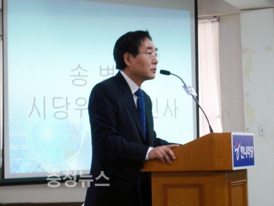 박성효 시장은 한나라당 당원들을 대상으로 한 특강에서 "대전이 녹색도시의 핵심적인 역할을 하고 있다"며 설명하고 있다.