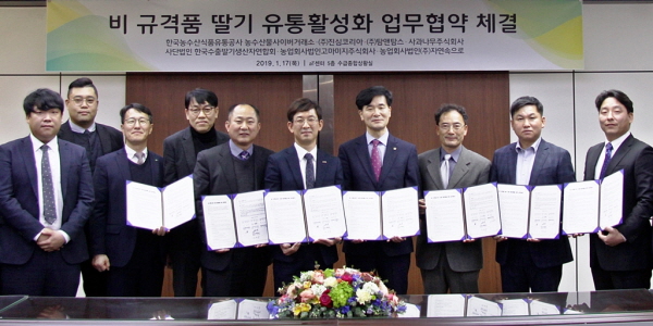 한국농수산식품유통공사(aT, 사장 이병호) 사이버거래소는 지난 17일 서울 aT센터에서 수출용 못난이 딸기 유통활성화를 위한 유명프랜차이즈업체와 딸기생산자단체 간 업무협약을 체결했다.