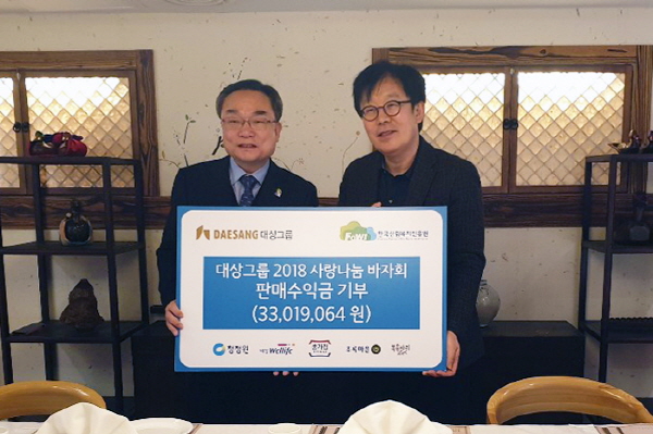 윤영균(좌측) 한국산림복지진흥원장이 18일 서울 동대문구 신설동 대상(주) 본사에서 대상그룹 권용석 상무로부터 ‘대상그룹 2018 사랑나눔바자회’의 판매수익금을 전달 받은 뒤 기념촬영을 하고 있다.