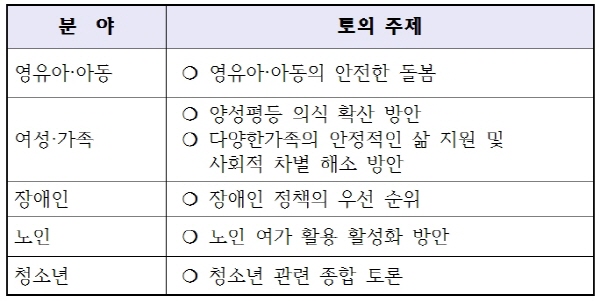 간담회는 21일 영유아·아동 분야, 23일 여성·가족 분야, 24일 장애인 분야, 28일 노인 분야, 30일 청소년 분야 등을 실시 한다.