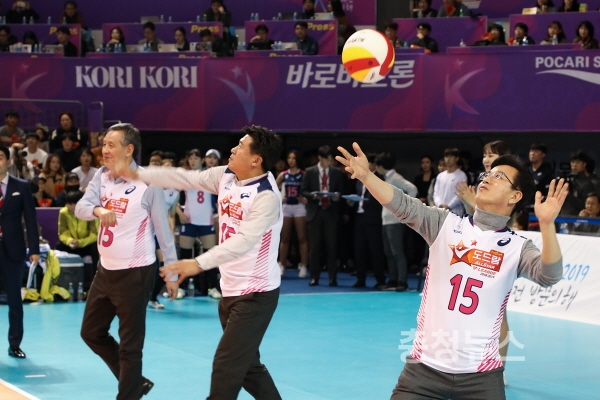 허태정 대전시장은 20일 오후 대전충무체육관에서 펼쳐진 도드람 2018~2019 V-리그 올스타전에 참석해 대전을 찾아준 전국의 배구팬들에게 환영의 인사를 전하고 대전방문의해에 대한 관심과 참여를 당부했다.