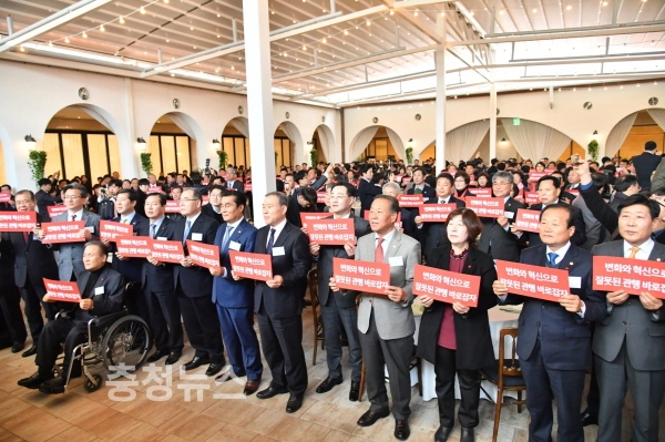 대전 라도무스 아트센터에서 21일 열린 전국 시군자치구의회의장협의회 정기총회에서 참석자들이 피켓을 들고 퍼포먼스를 하고 있다. 협의회는 이날 외유성 해외 관광을 하지 않는다는 등의 내용을 담은 자정 결의문도 채택했다.