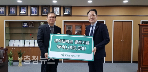 KEB 하나은행 대덕특구지점은 대덕대학교에 발전기금 4000만원을 기부했다.