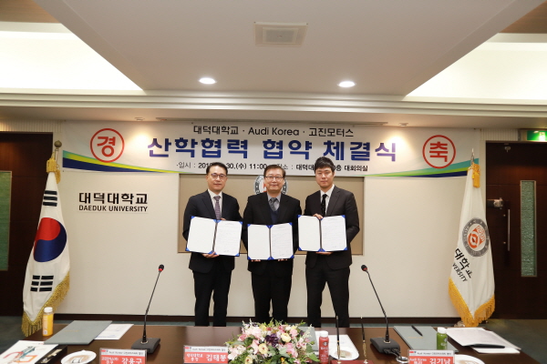 대덕대학교(총장 김태봉) 자동차학과는 30일 대덕대학교 정곡관 10층 대회의실에서 아우디코리아(Audi Volkswagen Korea Ltd), 고진모터스(주)와의 3자 간 산학협력 협약 체결 및 실습차량 기증식을 가졌다.