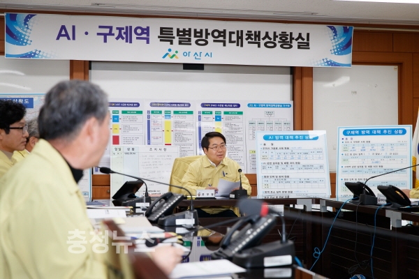 충남 아산시(시장 오세현)는 최근 경기도 안성에서 발생한 구제역에 대비해 지난 30일 농업기술센터 특별방역대책상황실에서 관계자와 함께 긴급회의를 개최하고 방역상황을 점검했다.