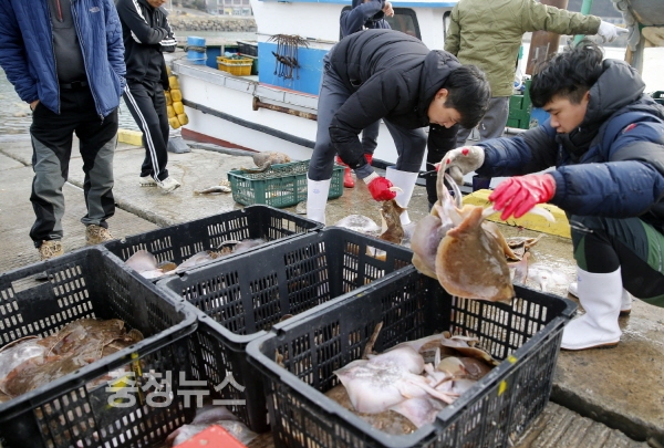 충남 태안군 소원면 모항항에서 갓 잡은 싱싱한 간재미를 선별하고 있다. 간재미는 찌개나 회무침 등으로 요리해 먹으며 겨울철 별미로 많은 이들의 사랑을 받고 있다.