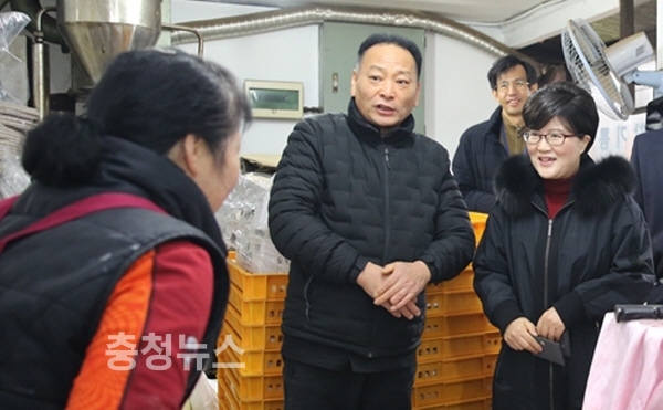 김진숙 행복청장(사진 오른쪽)이 설 명절을 앞둔 1일(금) 세종시 대평동에 있는 ‘대평전통시장’을 방문, 사회복지시설에 나누어 주기 위한 지역농산품을 구입하면서 시장 상인들의 애로사항과 시장활성화를 위한 의견을 청취하는 시간을 가졌다.