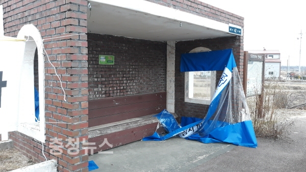 충남 논산시(시장 황명선)가 행정력을 집중해 설치한 버스정류장 바람막이가 찢어진 채 방치되고 있다.