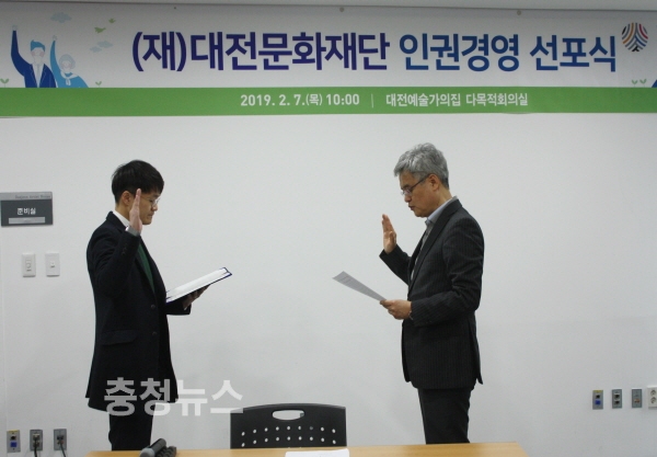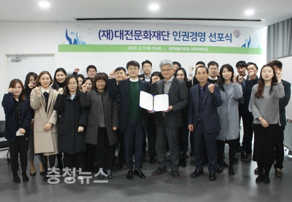 대전문화재단(대표이사 박만우)은 7일 대전예술가의집 다목적회의실에서 전 임직원이 참석한 가운데‘인권경영 선포식’을 개최했다.