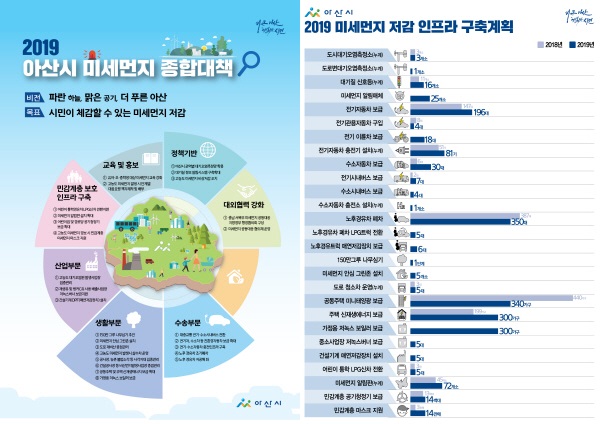 아산시는 올해 2월 15일부터 「미세먼지 저감 및 관리에 관한 특별법」이 시행됨에 따라 ‘파란 하늘, 맑은 공기, 더 푸른 아산!’이라는 비전과 함께 ‘시민이 체감할 수 있는 미세먼지 저감(2022년 대기질 PM-10 30㎍/㎥, PM-2.5 15㎍/㎥ 달성)’을 목표로 민선7기 공약사항을 반영한 ‘2019년도 아산시 미세먼지 종합대책’을 마련하고 전년보다 107억 증가한 179억원의 예산을 투입한다.