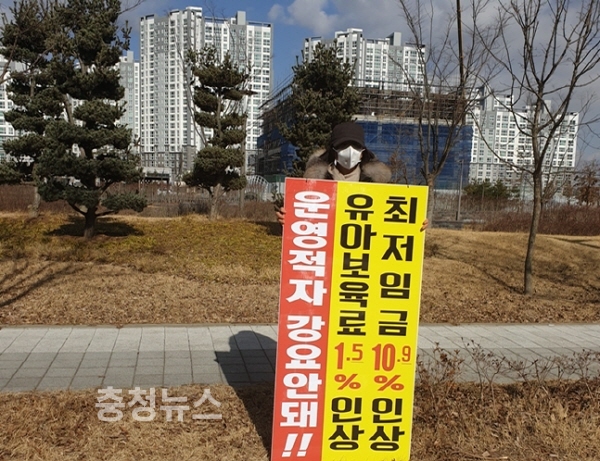 이경애 아산 이순신 어린이집 원장은 11일 충남도청 출입문앞에서 유아보육료 수납한도액 인상을 호소하기 위해 1인 피켓시위 활동을 펼쳤다.