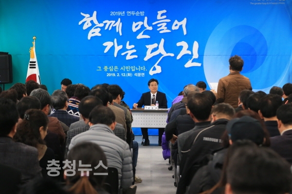 김홍장 당진시장이 지난 12일 석문문화스포츠센터에서 진행된 석문면 연두순방에서 올해 시정 운영방향을 밝히며 지속가능 성장으로 더 큰 도약을 이끌어 내겠다는 생각을 밝혔다.