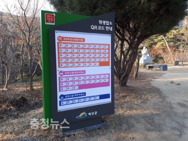 또 위생업소별 대표 이미지, 소개 글, 안내전화연결, 위치 찾기 등록메뉴로 구성됐으며 예산군 홈페이지와 연동되도록 해 네트워크를 기반으로 한 예산군 위생업소 안내와 교류 역할도 하게 된다. 예산군 위생업소 QR코드 안내 서비스는 현재 예산터미널, 예산역, 예당국민관광지, 수덕사, 충의사, 추사고택 등 10개 지역에서 가능하다.