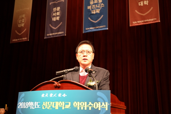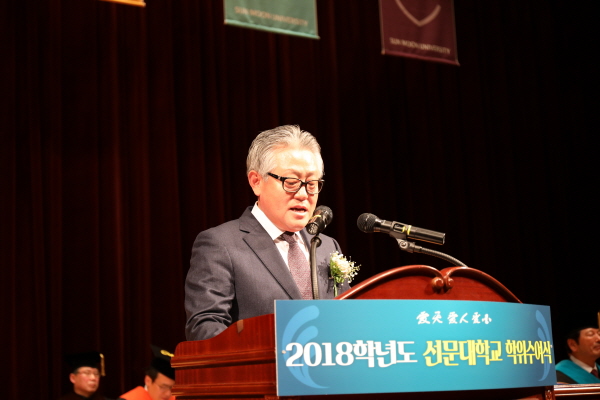 황선조 총장은 축사를 통해 “졸업생 여러분은 미래사회를 이끌어 나갈 ‘글로컬 서번트 리더’로서 역량을 키웠다”면서 “선문이 길러낸 자랑스런 동문”이라고 강조했다. 이어 “개인의 발전이 곧 우리 대학의 자랑스런 역사가 될 것이다”고 격려했다.