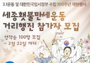 세종특별자치시(시장 이춘희)가 오는 28일 및 3월 1일 양일간 ‘3.1운동 및 대한민국임시정부 수립 100주년 재현행사’를 열기로 하고, 만세운동 거리행진에 참여할 시민 참가자를 22일 까지 선착순 모집한다.