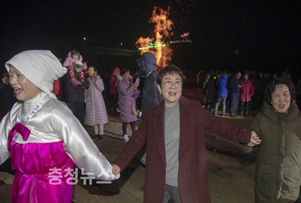 참석 주민과 손을 잡고 훨훨 타오르는 대형 소원달집을 돌며 강강술래를 하고 있는 박정현 대덕구청장