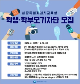 세종시교육청은 지역사회와 교육현장의 소통을 위한 「2019년 제5기 학생・학부모기자단」을 공개 모집한다고 18일 밝혔다.