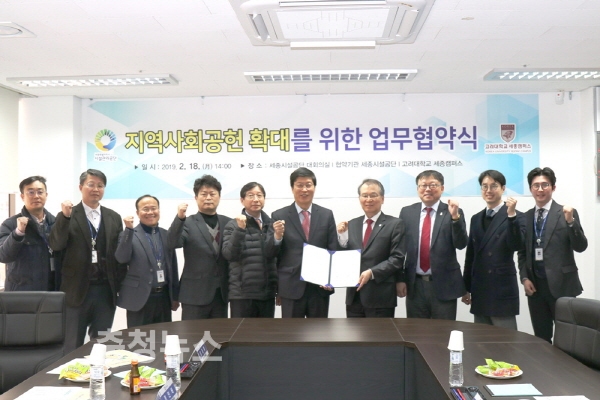 세종시설관리공단(이사장 신인섭)은 18일 공단 대회의실에서 세종시 사회봉사활동 등에 관한 상호 협력과 지역사회공헌 확대를 위해 고려대학교세종캠퍼스(세종부총장 안정오)와 업무협약(MOU)을 체결했다고 밝혔다.