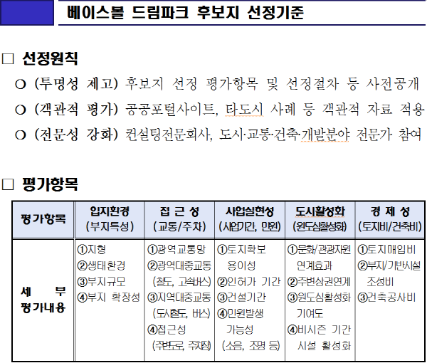 한편 대전시는 이날 새 야구장인 ‘베이스볼 드림파크’의 후보지 선정 기준을 발표했다.