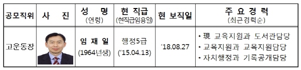 고운동장에 추천된 임재일 사무관은 ‘주민과 함께 만들어 가는 고운동’을 슬로건으로 주민과 소통하며 현장 행정 실천에 앞장서겠다고 강조했다.