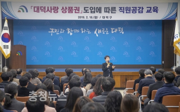 대전 대덕구(구청장 박정현)는 지난 18일 구청 청렴관에서 대덕사랑상품권 발행을 앞두고 지역화폐 제도 취지와 운영 방법 등에 대한 직원 공감교육을 실시했다.