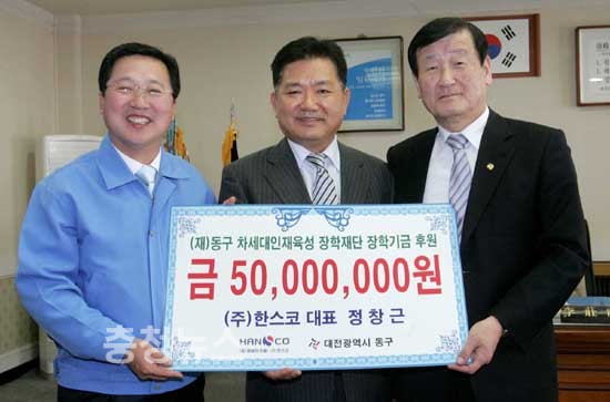 ▲ 사진 왼쪽부터 이장우 동구청장, 정창근 한스코 대표, 오응준 장학재단 후원회장)