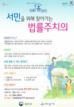 충남 아산시(시장 오세현)는 서민 법률복지를 위해 ‘찾아가는 서민 법률주치의, 법률홈닥터’를 운영한다고 5일 밝혔다.