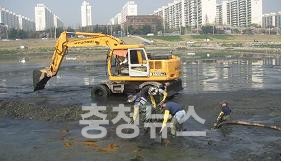 대전시에서는 대전천에 맑은물을 공급하기 위한 현장조사를 실시 시설관리공단에서 자체 보유하고 있는 흡입준설차를 이용 지난 4월 9일부터 22일까지 한밭대교 위 취수여울내 오니토를 준설했다.