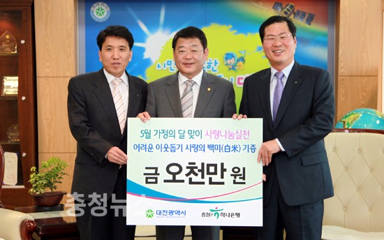 가정의 달 맞아 5천만원 기탁 충청하나은행충청사업본부(대표 박종덕)가 6일 가정의 달을 맞아 관내 경로당 어르신을 위해 써달라며 박성효 대전시장에게 성금 5천만원을 전달했다. ▲ 충청하나은행충청사업본부 박종덕 대표 경로당 어르신 돕기 성금 기탁 시는 이에 따라 경로당 735개소에 기탁금 5천만원 중 33백만원에 해당하는 백미20㎏ 809포를 지원했다. 아울러 기탁금 잔액은 2009 하반기 경로당 지원비로 쓰일 예정이다. 저작권자 © 충청뉴스 무단전재 및 재배포 금지 김거수 기자 다른기사 보기 기사가 마음에 드셨나요? 충청뉴스 좋은 기사 후원하기 1,000원 3,000원 5,000원 10,000원 30,000원 50,000원 직접입력 비회원 약관동의하기 ※ 소중한 후원금은 더 좋은 기사를 만드는데 쓰겠습니다.