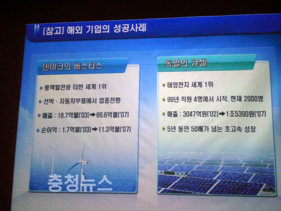신 사장은 특히 " 미래를 위해 젊은이들이 가슴을 열고 세계의중심을 보라며, 세계를 이끌어나갈 중심에 충청과 학생 여러분이 있다 가슴을 열고 미래를 보라면서 대체 에너지관련 사고를 키워달라"고 당부했다.