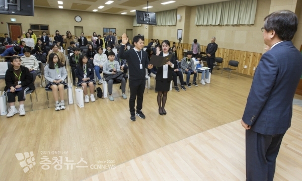 학생·학부모기자단의 선서를 받고있는 최교진 세종시교육청