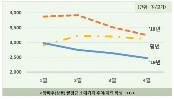 aT에 따르면, 양배추의 월평균 소매가격은 2,463원/1포기(4월 8일, 상품 기준)으로 최근 5개년 평균값(최대·최소값 제외)인 평년가격(3,119원/포기)과 비교해 20% 이상 저렴한 수준이다. 평년의 경우, 겨울 양배추가 본격 출하되는 1월에 가격 상승세를 보였다가 2∼4월은 가격 보합세를 보였다. 한편, 올해는 지난겨울 따뜻한 날씨로 겨울 양배추생산량이 크게 늘어 1월부터 가격 하락세를 보이며 낮은 시세를 유지하고 있다.