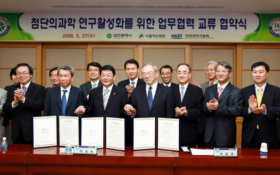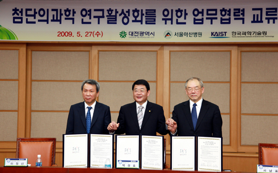 대전시(시장 박성효)는 27일 시청 대회의실에서 박성효 시장과 이정신 서울아산병원장, 서남표 KAIST 총장 등이 참석한 가운데 `첨단 의.과학 연구 활성화를 위한 업무협약'을 체결했다고 밝혔다.