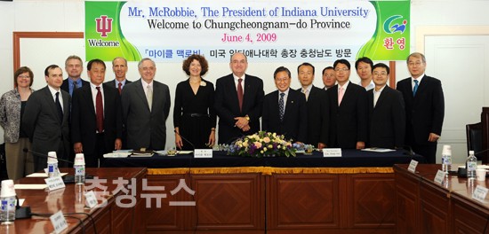 미국 인디애나대학 마이클 맥로비 총장이 충남도청을 방문해 김동완 행정부지사를 예방했다. 도는 4일 마이클 맥로비 총장 내외 및 오미에라 국제담당 부총장 등 일행이 도청을 방문해 상호 교류협력 등에 대해 의견을 나눴다고 밝혔다.
