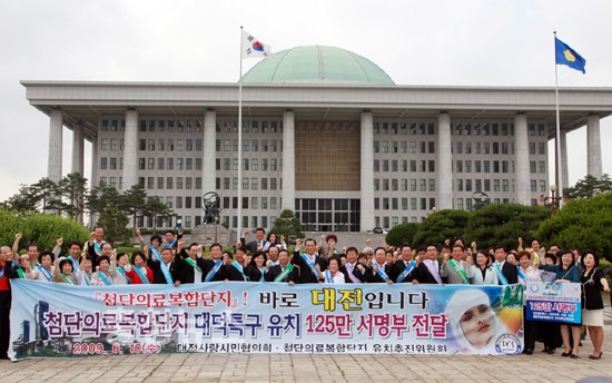 시청 북문서 첨복단지 대전유치 출정식 후 국회 등 방문 “3만명 과학인의 이목을 두려워하라” 박성효 대전시장이 10일 오전 시청 북문광장에서 200여 시민들과 함께 첨복단지 대전유치 출정식을 갖고 보건복지부, 국무총리실, 국회 보건복지가족위 등을 잇달아 방문했다. ▲ 시청 북문서 첨복단지 대전유치 출정식 후 국회 등 방문 시는 10일 박 시장이 김시중 유치추진위원장(전 과기부장관), 홍성표 대전사랑시민협의회장, 권선택·김창수·이재선·임영호 의원, 전병배 대전시의회 첨복특위위원장 등과 함께 국회를 방문, 125만 시민들의 염원을 담은 서명부를 전달했다고 밝혔다. ▲ 시청 북문서 첨복단지 대전유치 출정식 후 국회 등 방문 이들은 유영학 복지부차관, 국무총리실 박영준 차장·권태신 실장 등에게 “이 서명부에 150만 대전시민의 뜨거운 염원이 담겼다”며 “대한민국의 미래가 달린 국책사업을 정치적 논리로 접근하지 말라”고 압박했다. 또 “대덕연구개발특구 3만여 과학인들의 이목이 첨복단지 입지 선정에 쏠려있다”며 “35년간 과학자들의 헌신과 땀으로 이룩한 오늘의 경제성장과 과학입국을 잊지 말라”고 강조했다. ▲ 첨복유치(국회) 아울러 “현 정부가 과학에 대한 소신과 애정을 버리지 않았음을 이번 기회에 확실히 보여 달라”며 “당초 9일이었던 제안서 마감일이 16일로 연기된 이유가 무엇이냐”고 따져 물었다. 이와 함께 “가장 공정하고 투명한 절차에 따라 입지가 선정된다면 35년간 30조원이 투자돼 모든 과학 분야의 융·복합이 가능한 대덕특구만이 최적지”라고 주장했다. 저작권자 © 충청뉴스 무단전재 및 재배포 금지 김거수 기자 다른기사 보기 기사가 마음에 드셨나요? 충청뉴스 좋은 기사 후원하기 1,000원 3,000원 5,000원 10,000원 30,000원 50,000원 직접입력 비회원 약관동의하기 ※ 소중한 후원금은 더 좋은 기사를 만드는데 쓰겠습니다.