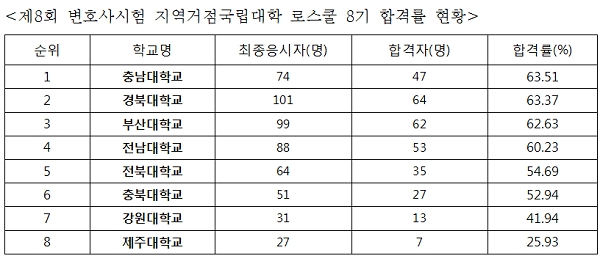 법무부가 지난 1일 공개한 ‘제8회 변호사시험 합격자에 대한 대학별 합격률’에 따르면 충남대 로스쿨 8기생(2016학번)들의 합격률이 63.51%로 전국 국립대 중 1위를 차지한 것으로 확인됐다.
