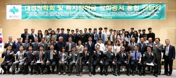대전대학교는 8일 대학 30주년기념관 하나컨벤션홀에서 2019학년도 1학기 ‘대경장학회 및 특지장학금 전달식’을 개최했다.