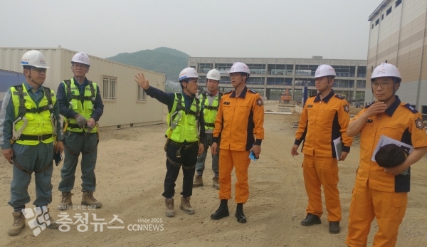 김수환 조치원소방서장이 13일 소정면 고등리 세종첨단산업단지에 위치한 ㈜포스코케미칼 건축 공사현장을 방문해 용접 화재 피해 저감을 위한 안전관리 실태 점검을 실시했다.