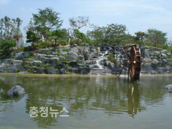 ▲ 이인구 명예회장이 소개한 유림공원내 벽천, 물레방아