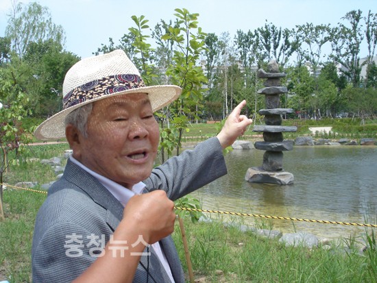 ▲ 이인구 명예회장이 한반도 모양의 반도지(연못)에서............