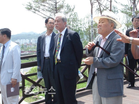 ▲ 이인구 명예회장이 기자들에게 공원소개를 하고 있다.